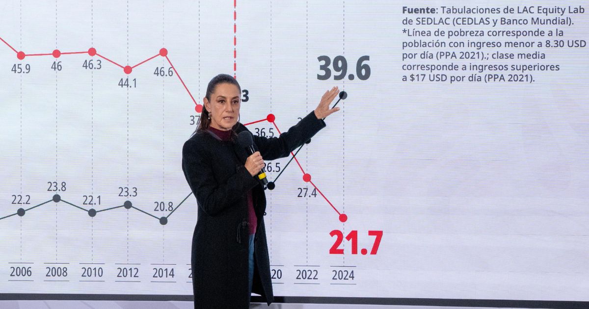 Lo relevante es que dos metodologías distintas señalan lo mismo. El Banco Mundial, midiendo por ingresos, reporta que la pobreza cayó 13.6 puntos mientras que la clase media subió 12.4, lo que indica un traslado directo de los pobres a la clase media. El INEGI, con una medición multidimensional, confirma la tendencia desde otra perspectiva: la población “no pobre y no vulnerable” —clase media y alta— pasó del 29.3% en 2018 al 42.3% en 2024. Todos estos datos indican que, por primera vez en lo que va del siglo, la curva de la clase media (39.6%) rebasó la de la pobreza (21.7%).