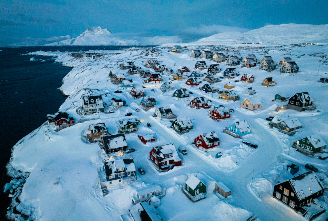 Irse acercando a esta gran blancura eterna, saliendo de algún puerto europeo el trayecto lleva a las Islas Feroe conjunto de 18 islas verdes con cascadas que caen directamente al mar y cuya capital Tórshavn es una pequeña villa que en ocasiones parece como una pintura paisajista. Groenlandia tiene costas al mar Ártico y al Océano Atlántico, temperaturas de -20 C en invierno hasta 10 C en verano, la pueblan cerca de 60,000 habitantes daneses (inuit y daneses), su Capital es Nuuk con 16,000 habitantes. Son autónomos del Reino de Dinamarca desde 1979, en 2008 ampliaron los términos de la misma e incrementaron el poder controlar sus recursos naturales, súbditos del Rey Federico X, la Primer Ministra Mette Frederiksen (PSD desde 2019, 41 años), Jens Frederick Nielsen electo en 2025 por 4 años del PSD. Poder legislativo con 31 miembros y poder Judicial independiente. Son 5 ciudades grandes y pequeños poblados.